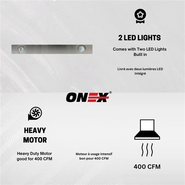 Premium quality with 400 cfm airflow, 2 speed fan, powerful motor, 24 inch duct able range hood will quickly ventilate your kitchen and keep the noise level as low as 52 dB to bring you an amazing cooking experience. ONEX® range hood comes with aluminum mesh filter. The aluminum mesh filter is easy to pop out and can be places in the dishwasher for easy to clean. The aluminum mesh filter trap smoke and cooking grease/oil efficiently. Leaves your kitchen clean with fresh air. Easy to use push-button control panel makes it extremely easy to operate for anyone. ONEX offers heavy-duty fans with three speed controls for every kind of cooking. It is suitable for different cooking methods. Comes with 2 x 2 W LED lights to make your cooking area brighter.