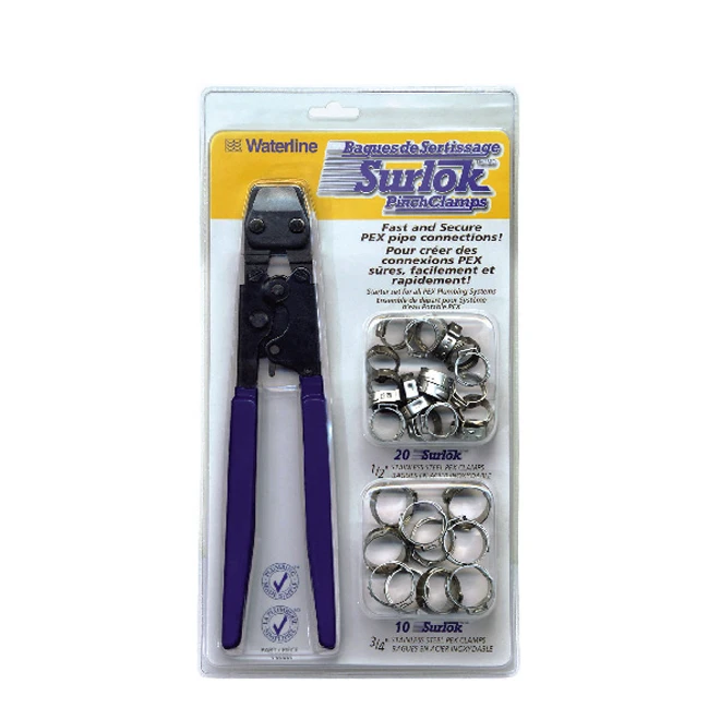 This Waterline set from the Surlok series includes an 11″ crimp tool with a rubberized grip handle and 30 stainless steel clamps for 1/2″ and 3/4″ pipes.