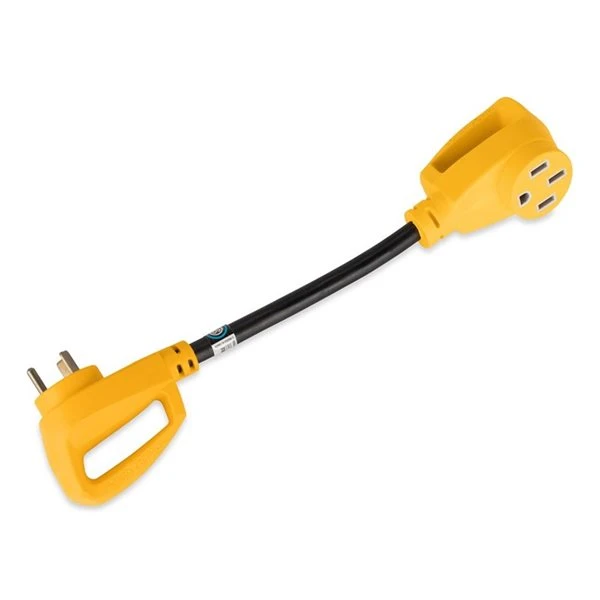 The Camco Heavy-Duty RV Dogbone Electrical Adapter with PowerGrip Handle (30-Amp Male to 50-Amp Female, 18-In) is designed to allow you to hookup to your campground’s power pedestal, adapting the connection to fit your 50-amp RV. Extremely flexible in design, the cord is coated with a heavy-duty flame retardant, heat-resistant PVC sheath that serves as protection from the outdoor elements, wear and tear.