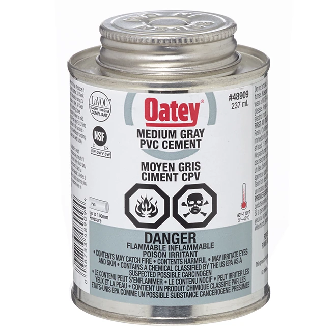 - Medium bodied grey colored cement for use on PVC pipe and fittings