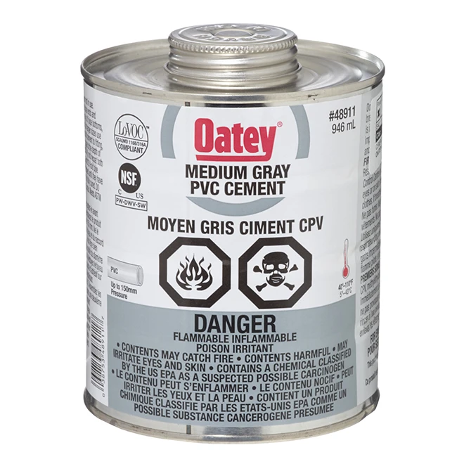 The Oatey® medium-bodied cement is formulated for use on all schedules and classes of PVC pipe and fittings up to 6” in diameter with interference fit. Recommended for potable water, pressure pipe, conduit and DWV. with a recommended application temperature of 40°F to 110°F / 4°C to 43°C. The low VOC solvent cement meets California South Coast Air Quality Management District (SCAQMD) 1168/316A or BAAQMD method 40 as well as ASTM D-2564 and various environmental requirements. This product is covered by a 1-year warranty.