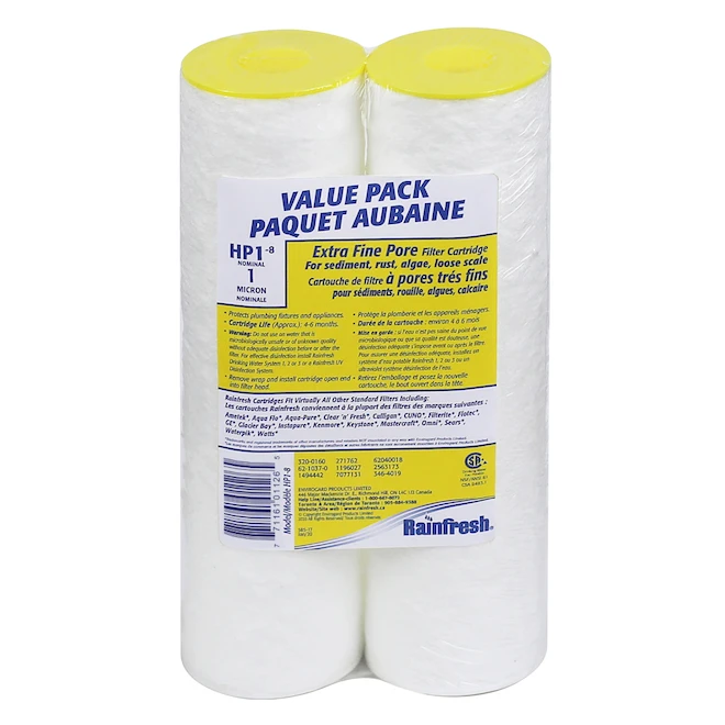 These Rainfresh HP1 filter cartridges are able to retain particles as small as 1 micron. Their very fine pores are able to trap sediment, rust, algae and limescale. These HP1 cartridges have a life span of 4 to 6 months.