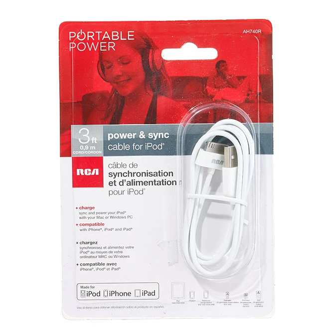 This RCA 3′ long charge cable for iPhone, iPad, and iPod allows not only to charge your Apple device but also to sync your data. This cable is compatible with all devices equipped with the 30-pin port. This cable is backed by a limited lifetime warranty.