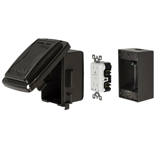 This medium bronze while-in-use cover metal kit features a robust stainless steel hinge pin / ideal for high-traffic areas. One cover handles GFCI, single, duplex or switch configurations. Red Dot Code Keeper extra-duty nonmetallic weatherproof while-in-use covers make it easier than ever to comply with Canadian Electrical Code (CEC) requirements for receptacles in wet locations.