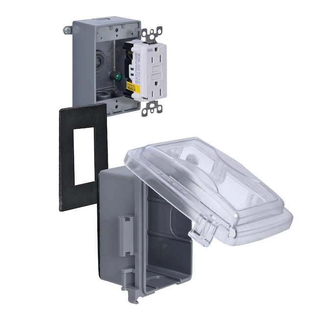 This metallic single-gang universal GFCI receptacle kit with /extra-duty/ while-in-use cover is weather and tamper-resistant. It has 17.3 cubic inch capacity and can be used horizontally or vertically.