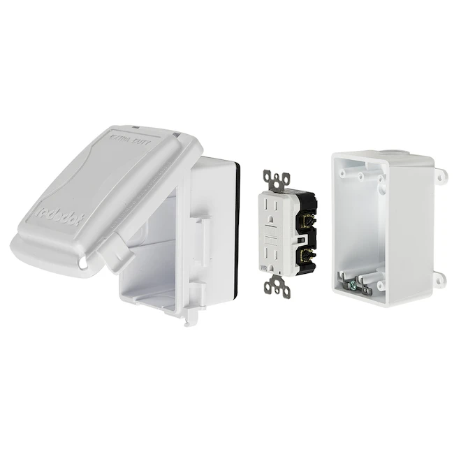 This white PVC while-in-use cover kit features a robust stainless steel hinge pin / ideal for high-traffic areas. One cover handles GFCI, single, duplex or switch configurations. Red Dot Code Keeper extra-duty nonmetallic weatherproof while-in-use covers make it easier than ever to comply with Canadian Electrical Code (CEC) requirements for receptacles in wet locations.
