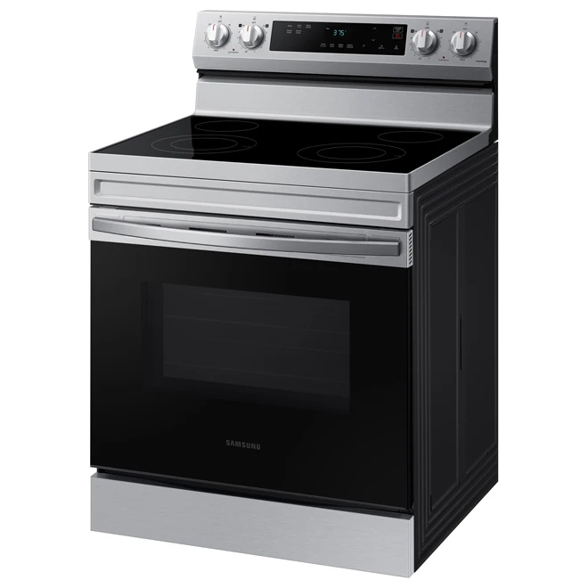 Bring premium style and versatility to your kitchen. The Samsung freestanding range with Wi-Fi connectivity adds a modern look and offers a connected user experience. Compatible with Samsung SmartThings, this range ensures a seamless and stress-free cooking experience as you can control cooking time and temperatures from your smartphone or any other smart device. The 4-element cooktop includes a convenient 3300 Kw Rapid Boil with flexible cooktop precise control, and powerful heat. Its stainless-steel design gives a premium look and solid durability.