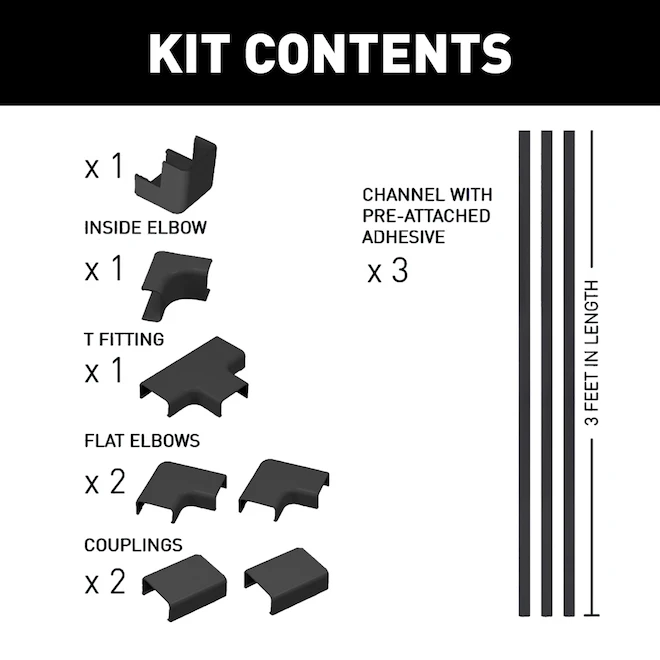 - Kit comes with three sections of 4-ft pieces of channel with pre-attached adhesive backing for quick, peel and press installation