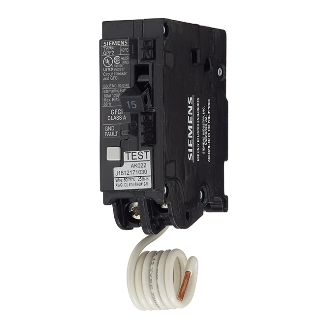 This Siemens 15 A rated GFCI 1-pole circuit breaker features a self-test function. If the breaker detects that it has been compromised, it trips itself and locks in this position so that it can’t be reset. It also features protection against ground-fault protection. The breaker is CSA licensed for HACR-type equipment (Heating, Air Conditioning & Refrigeration). Typical applications for a single pole 15 A breaker include lighting and receptacle circuits in a home and requiring a wire size of 14-2. The breaker provides overload and short circuit protection (120 V AC).