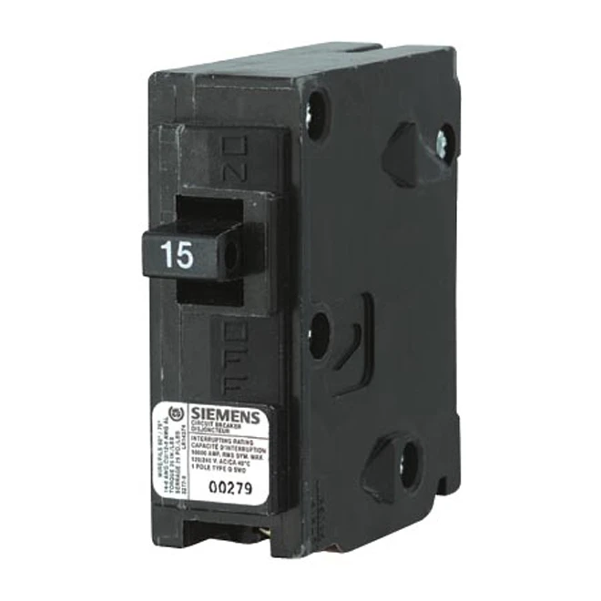 Single pole thermomagnetic circuit breaker. 15 A. 110 V/240 V. One-piece moulded plastic case. Easy to install. No bolts required. Quick On/Off switch. Reliable protection. Use this space-saver device to double the number of useasable circuits for light fixtures and electrical plugs. Works with all Siemens LoadCentre panels. 10,000 amp interrupting rating (AIR). Black. Also offered in 20 A and 30 A.Single pole thermomagnetic circuit breaker. 15 A. 110 V/240 V. One-piece moulded plastic case. Easy to install. No bolts required. Quick On/Off switch. Reliable protection. Use this space-saver device to double the number of useasable circuits for light fixtures and electrical plugs. Works with all Siemens LoadCentre panels. 10,000 amp interrupting rating (AIR). Black. Also offered in 20 A and 30 A.Single pole thermomagnetic circuit breaker. 15 A. 110 V/240 V. One-piece moulded plastic case. Easy to install. No bolts required. Quick On/Off switch. Reliable protection. Use this space-saver device to double the number of useasable circuits for light fixtures and electrical plugs. Works with all Siemens LoadCentre panels. 10,000 amp interrupting rating (AIR). Black. Also offered in 20 A and 30 A.