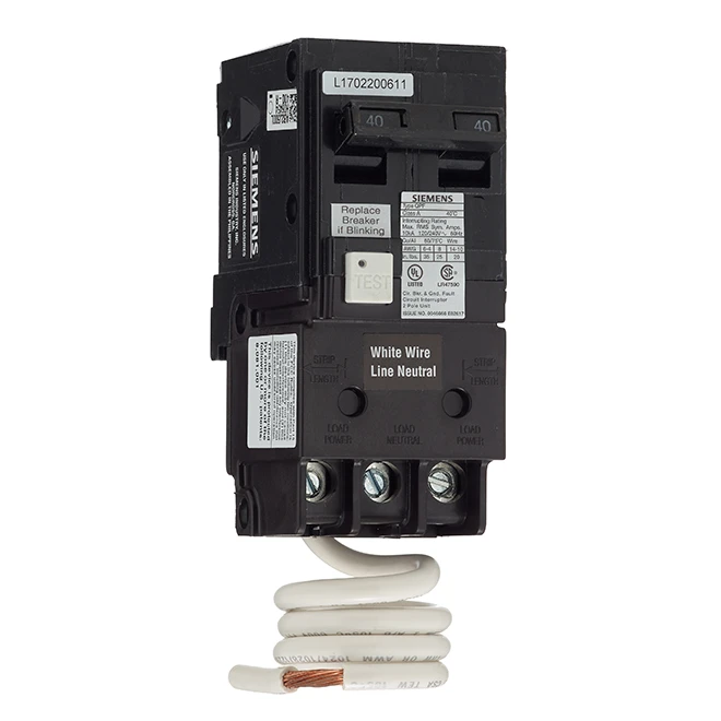 This Siemens 40 A rated GFCI 2-pole circuit breaker features a LED which allows to easily identify the tripped breaker. It also features a self-test function: if the breaker detects that it has been compromised, it trips itself and locks in this position so that it can’t be reset. This circuit breaker range is designed to detect ground faults. The breaker provides overload and short circuit protection (120/240 V AC).