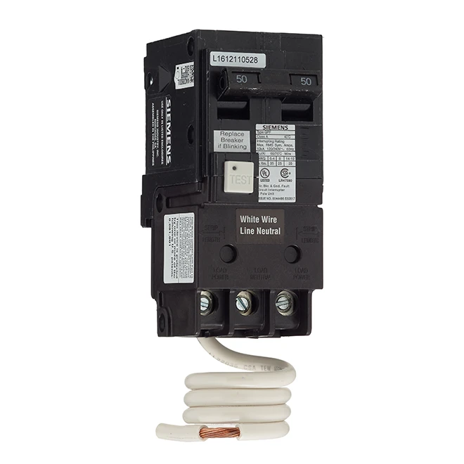 This Siemens 50 A rated GFCI 2-pole circuit breaker features a LED which allows to easily identify the tripped breaker. It also features a self-test function: if the breaker detects that it has been compromised, it trips itself and locks in this position so that it can’t be reset. This circuit breaker range is designed to detect ground faults. The breaker provides overload and short circuit protection (120/240 V AC).