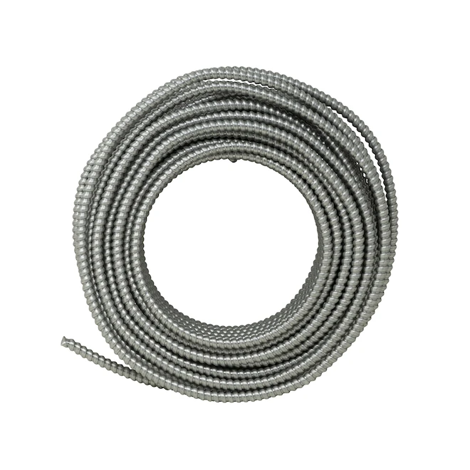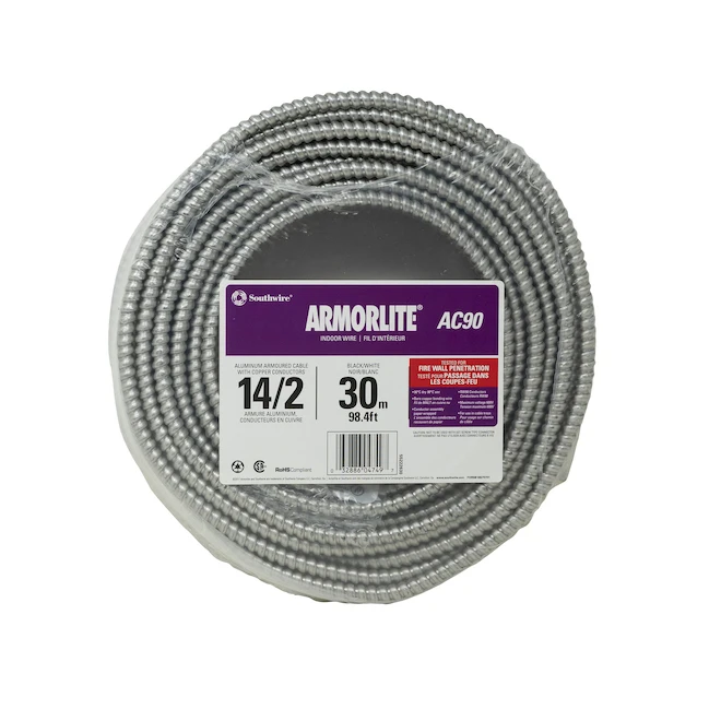 Copper building wire, aluminum, 30-m spool, AC90 14/2. CSA, 600 V, 15 amp. Aluminum interlocking armoured cable. Cross-linked polyethylene RW90 conductors with copper bonding wire for open and concealed wiring in dry locations only. For use in cable troughs and ventilated flexible cable ways in dry locations only.