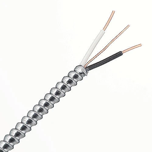 Copper building wire, aluminum, 75-m spool, AC90 12/2. CSA, 600 V, 20 amp. Aluminum Interlocking armoured cable. Cross-linked polyethylene RW90 conductors with copper bonding wire for open and concealed wiring in dry locations only. For use in cable troughs and ventilated flexible cable ways in dry locations only.