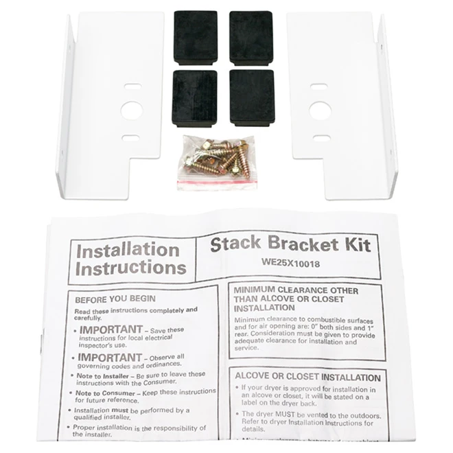 Support kit used for installations of dryers on top of washers. To use with fixed or mobile washer/dryer..