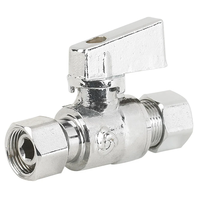This John L. Schultz oAqua-Dynamic” straight ball stop valve has a 3/8 in. OD female compression inlet and a 3/8 in. OD compression outlet. It operates using a simple quarter turn. It is designed for up to 200 PSI and a maximum temperature of 80 °C (176 °F) and meets the NSF/ANSI 372 lead-free standards.