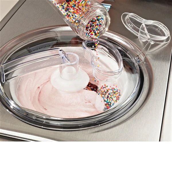 - Refill opening with attached lid lets you add ingredients like nuts, fruits, or candy pieces while machine is in operation