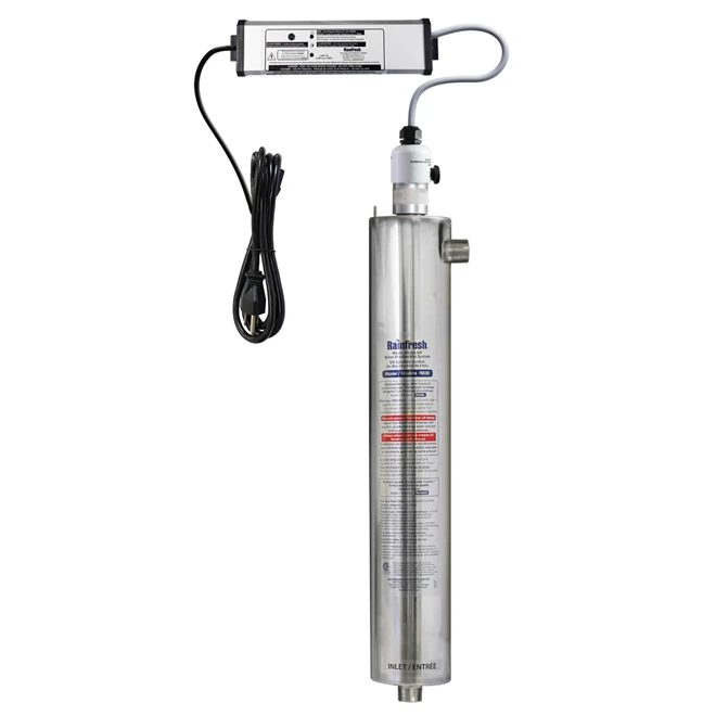 Whole house ultraviolet (UV) water disinfection system. Kills/inactivates harmful bacteria and viruses at 99.99%. Rated flow 30 litres/min. inlet and outlet size 3/4″ NPT(MIP). Electrical supply 120V, 50/60HZ, 0.7A