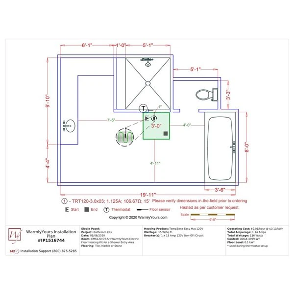 - This kit fits a bathroom with shower entry area, comes with a 120 V Tempzone floor heating mat, a nSpire touch wifi programable thermostat, and a circuit checker tool
