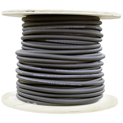 Rubber-covered round black wires, 75-m spool. SOOW 14/3. CSA, 600 V. Weather-resistant, oil-resistant insulation and jacket. Power supply to outdoor equipment, barbecues, portable power tools, lawnmowers, where the cord is subjected to hard usage in dry, damp or wet locations and exposed to oil.