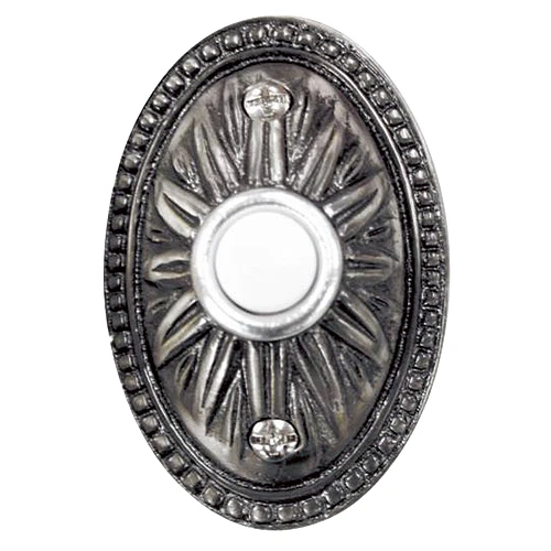 This wired door button by Heath Zenith is oval with sunburst detail. This unit also features a lustrous pewter finish and a lighted button.