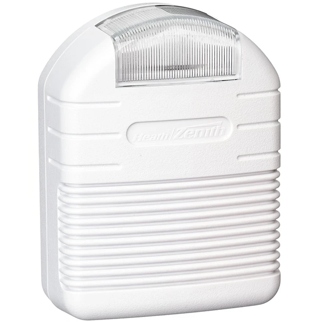 This Heath Zenith wireless chime with sound and strobe style lightning alert. Ideal for people with hearing problem and noisy area. It has to be plugged in a power outlet. This product is covered by a warranty against manufacturing defects. This product is white and the size is 1/2″ x 1 3/4″ x 4 5/8″.