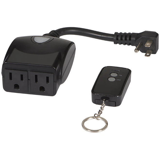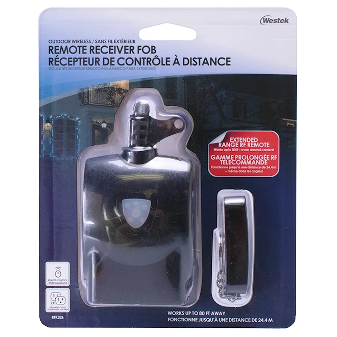 This Westek(R) wireless device is designed to remotely control your outdoor lights. Featuring two electrical outlets with ground, this device has a range of up to 80′. Includes a receiver as well as a remote control with chain and key ring.