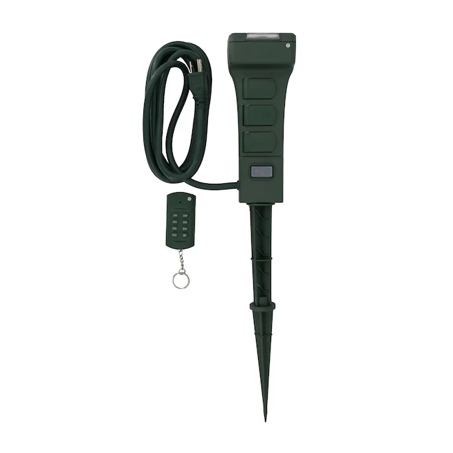This 6-outlet yard stake has a 6-setting timer. It features a 10-ft cord and has a 100-ft range remote control.