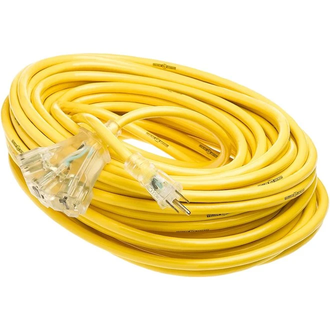 This versatile 30 m Yellow Jacket extension cord is designed to meet the specific needs of the professional contractor for outdoor work, in garages or workshops. Equipped with a 14-AWG wire gauge, it has a voltage of 125 volts and a maximum usable amperage of 15 A. Its lighted tri-tap allows you to connect several electrical devices at the same time, while its grounding makes its use completely safe. It offers 30-50% more flexibility than standard cords, even at very low temperatures (max -50 °C). This durable SJTW extension is certified resistant against weather, oil spills and UV rays. Backed by a 1-year limited warranty.