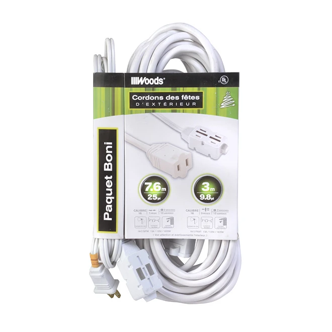 Woods® 2 extension cords combo. Perfect for all your outdoor holiday decorations. 7.6 m (1 outlet) and 3 m (3 outlets). 16/2 gauge, copper. 1-year warranty.