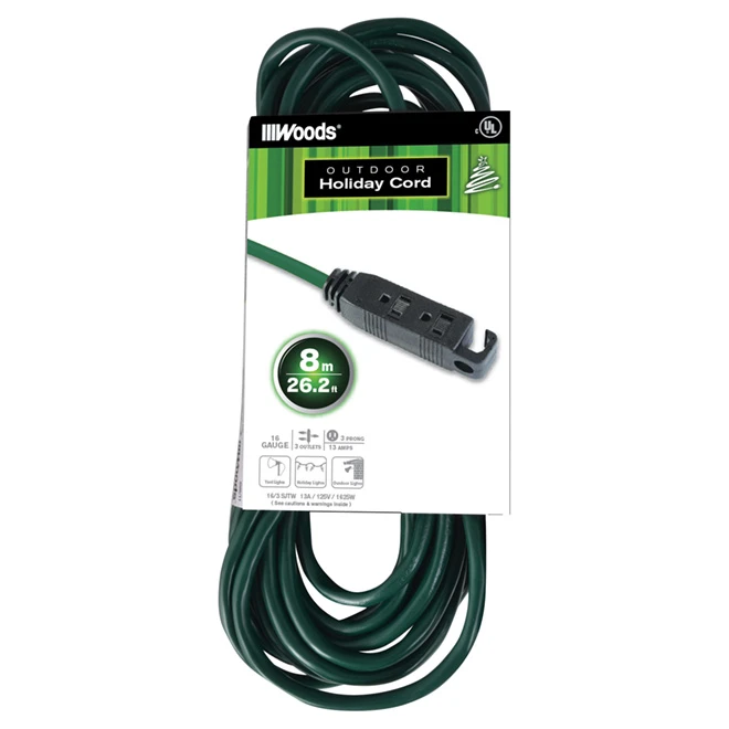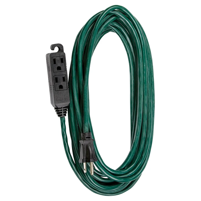 Woods SJTW green extension cord. Black banana end. Grounded cord for outdoor or indoor use.16-gauge, 3-prong