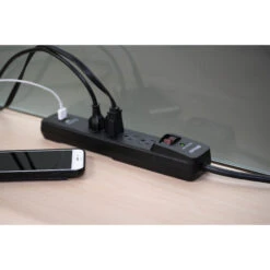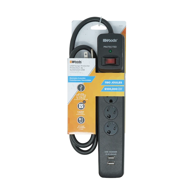 This 4-outlet Woods power bar is equipped with a 3-in electric cord and an on/off switch, which saves energy. It is also equipped with 2 USB ports and overload and surge protection, allowing the use of electronic accessories with complete peace of mind.
