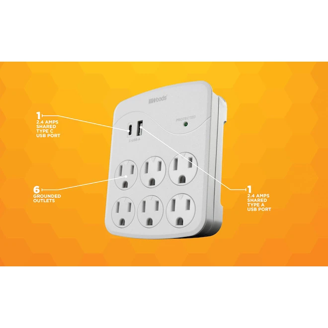 Protect your devices with this Woods 6-outlet surge protection wall adapter. The surge protection adapter can accommodate any type of regular plugs, while having a protection capacity of 560 joules. The USB outlets have a power of 2.4 amperes. The adapter has a phone cradle as well as a USB-A and a USB-C outlet. You can even quickly and easily remove the adapter and move it to a different room thanks to the EZ-Pull design. This product is backed by a 1-year limited warranty.